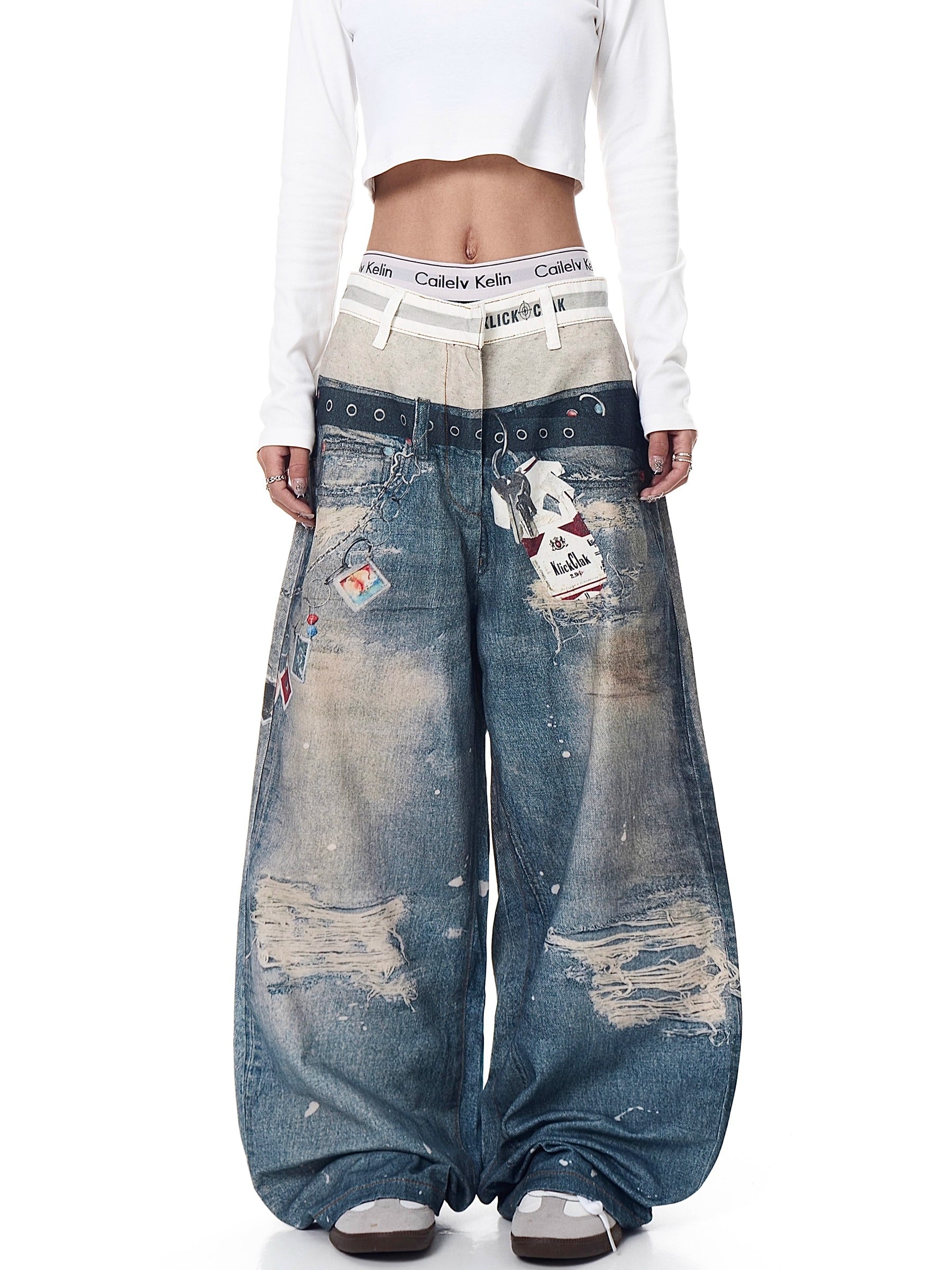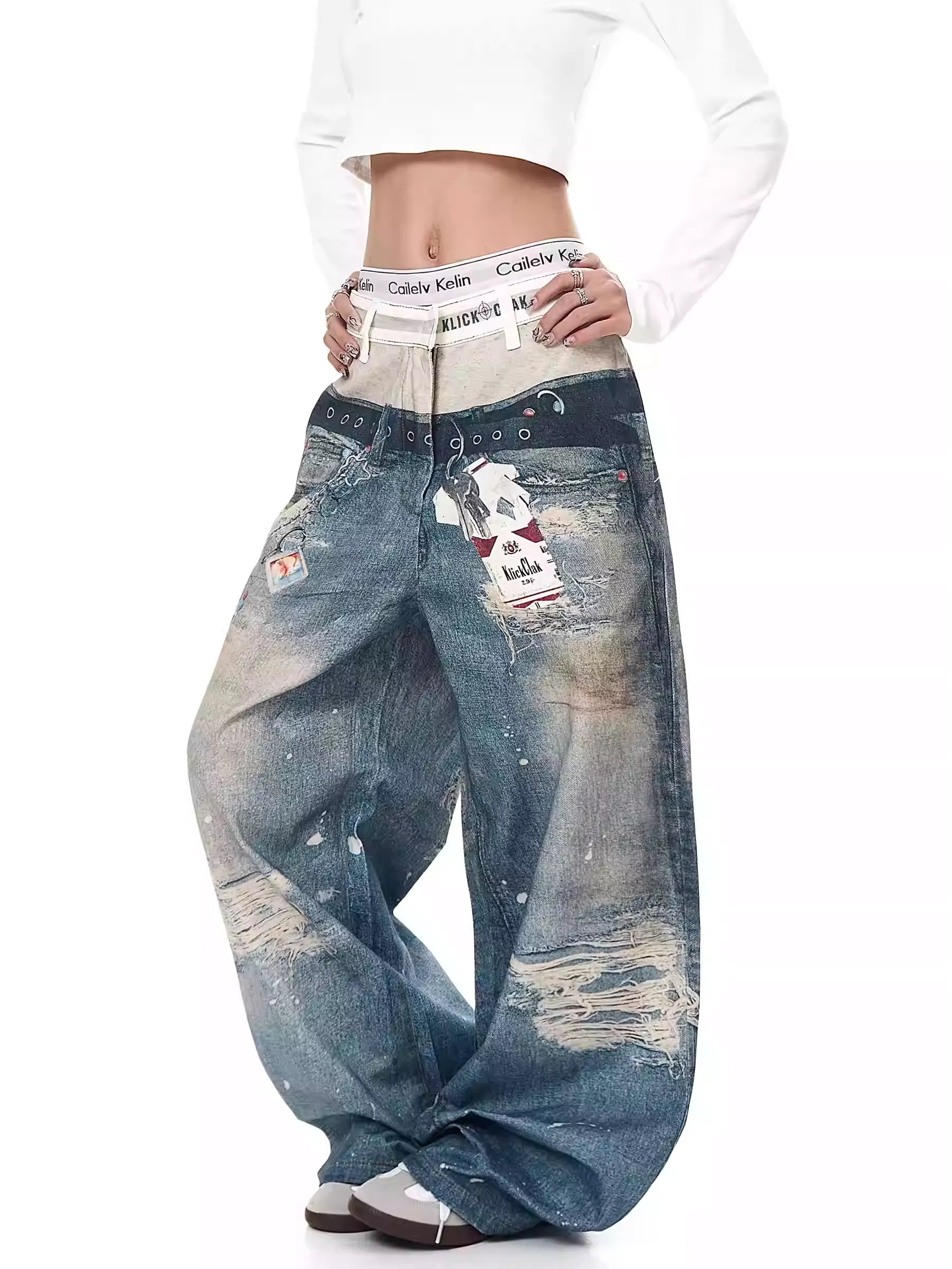 Retro 3D Print Double-Waist Straight-Leg Jeans