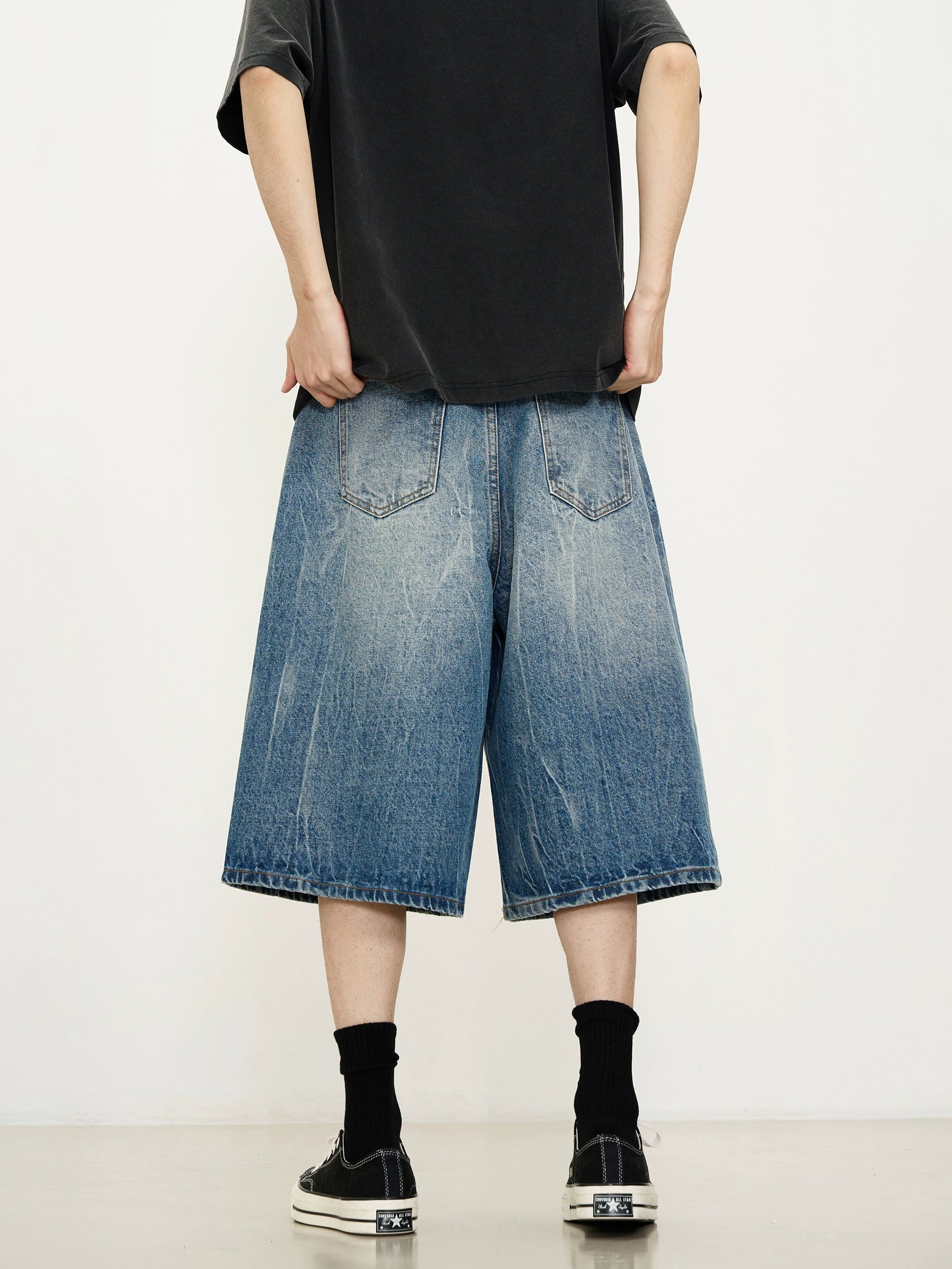Washed Lightning Pattern Denim Shorts